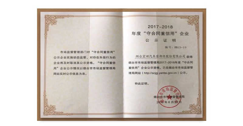 煙臺(tái)宏田汽車零部件股份有限公司 獲得煙臺(tái)市市場(chǎng)監(jiān)督管理局2017-2018年度 “守合同重信用企業(yè)”