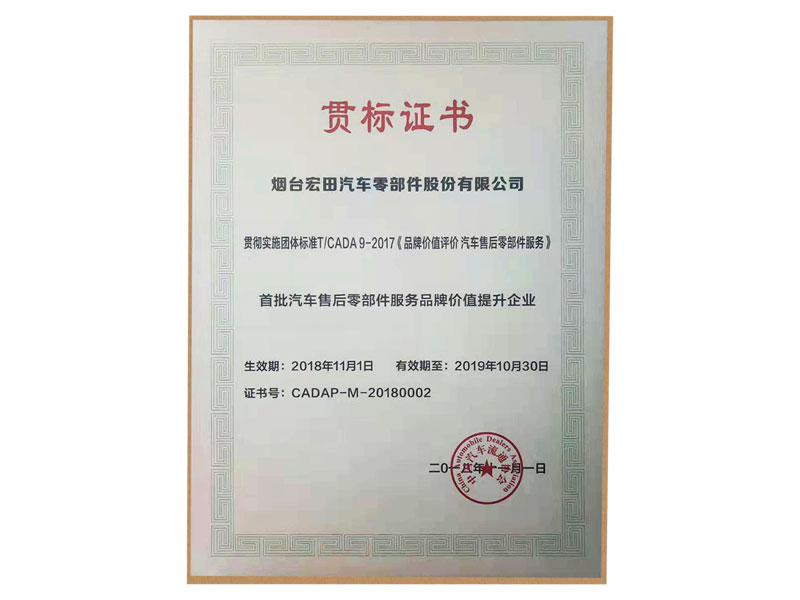 宏田公司獲得首批中國(guó)汽車流通協(xié)會(huì)汽車售后零部件服務(wù)品牌價(jià)值提升貫標(biāo)企業(yè)